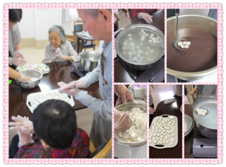 5月のお誕生日会に ぜんざい作りをしました。 入居者様とスタッフで わいわいしながら白玉を作りました。