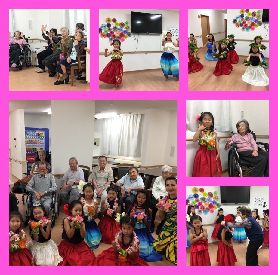 本日は地域の子供達が利用者様にフラダンスを披露しに来てくれました(^。^) みんな、最高に可愛くて利用者様も笑顔で子供達を見つめていました(^ ^) 利用者様から1人1人にお菓子のレイをプレゼントして頂き、少し緊張していた子供達の顔からも笑顔が見れて、楽しいひと時を過ごせました 本当に可愛くて可愛くて最高でした(^。^)