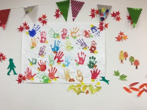 利用者様に秋を楽しんで頂こうって事で、一人一人の手形を紅葉にさせて頂きました(^ ^)