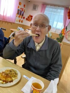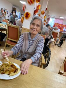 善幸苑鶴見です今月のレクリエーションは、食欲の秋ということで、お好み焼きと焼きそばをスタッフが手作りしました
