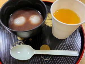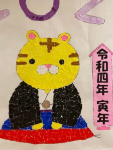 鏡開きの日は善哉を皆様に召し上がって頂きました。書いて頂いた作品は昨年末から入居者様とスタッフが作った貼り絵と一緒に施設内に展示しています