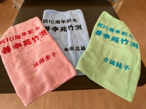 10周年記念品としネーム入りのバスタオルをプレゼント