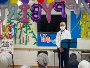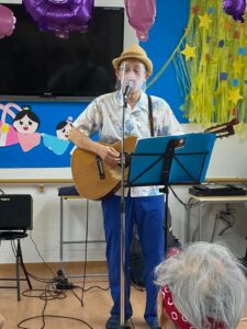 まずは10周年記念にと西代表からあいさつして頂き、シンガーソングライターの谷さんにも来て頂き昔懐かしの歌を利用者様と一緒に楽しみました