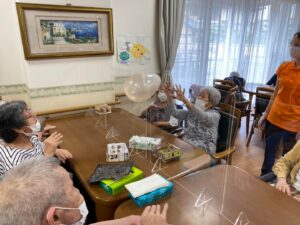 おやつの前には運動です、風船バレーでスタッフも汗びっしょり