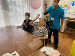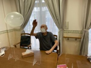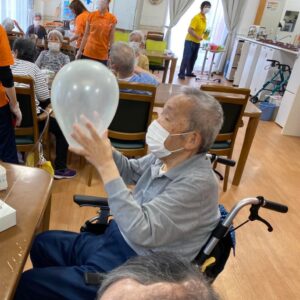 おやつの前には運動です、風船バレーでスタッフも汗びっしょり