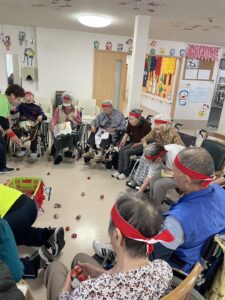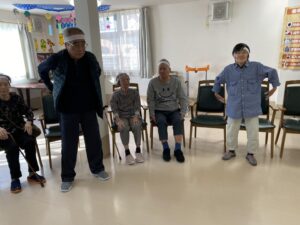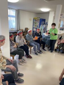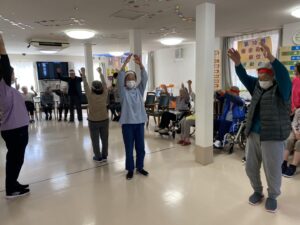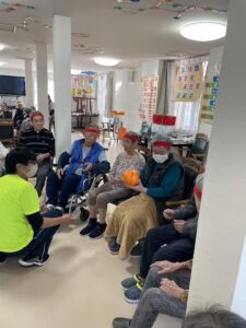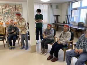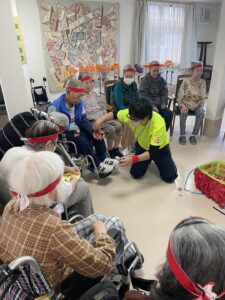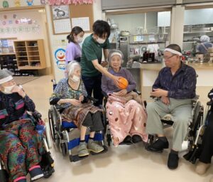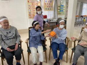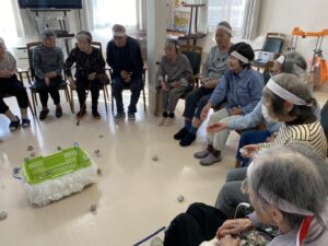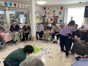 ボール渡し…隣の方にボールを渡していただきました。落として悔しがる入居者様もいれば、麻痺のある方のお手伝いする入居者様もいました。