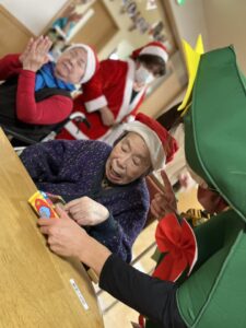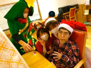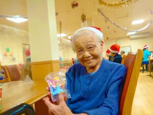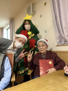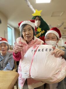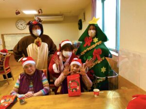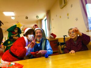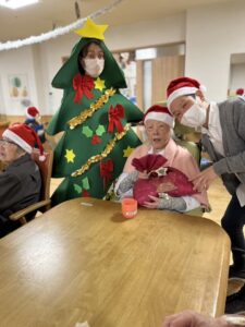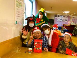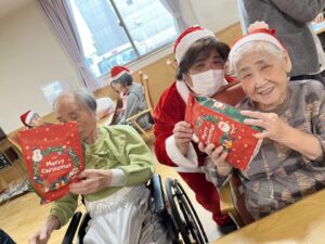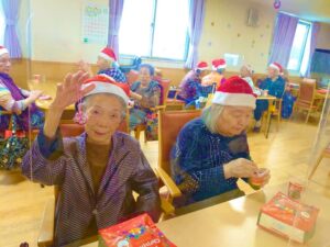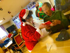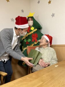 サンタさんから利用者様へクリスマスプレゼントをお渡しして、美味しいケーキを用意しました