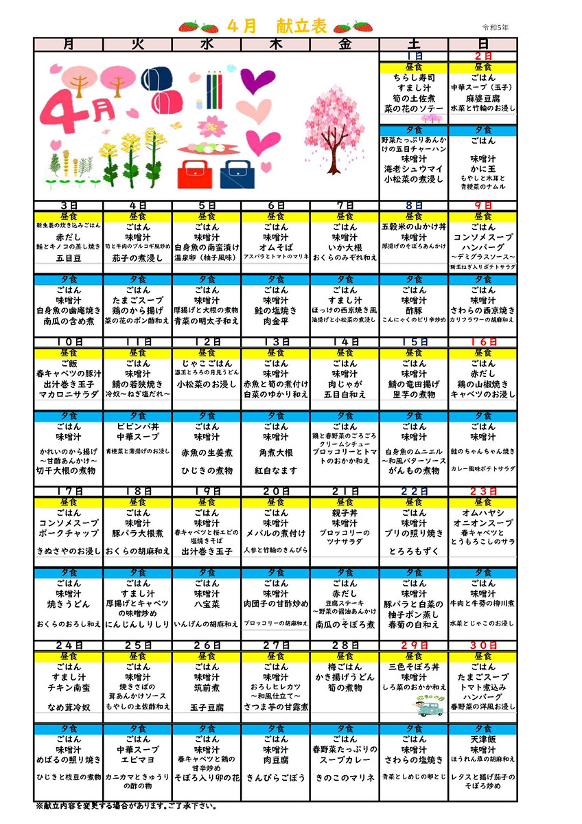 4月の献立が完成致しましたので、お知らせします!