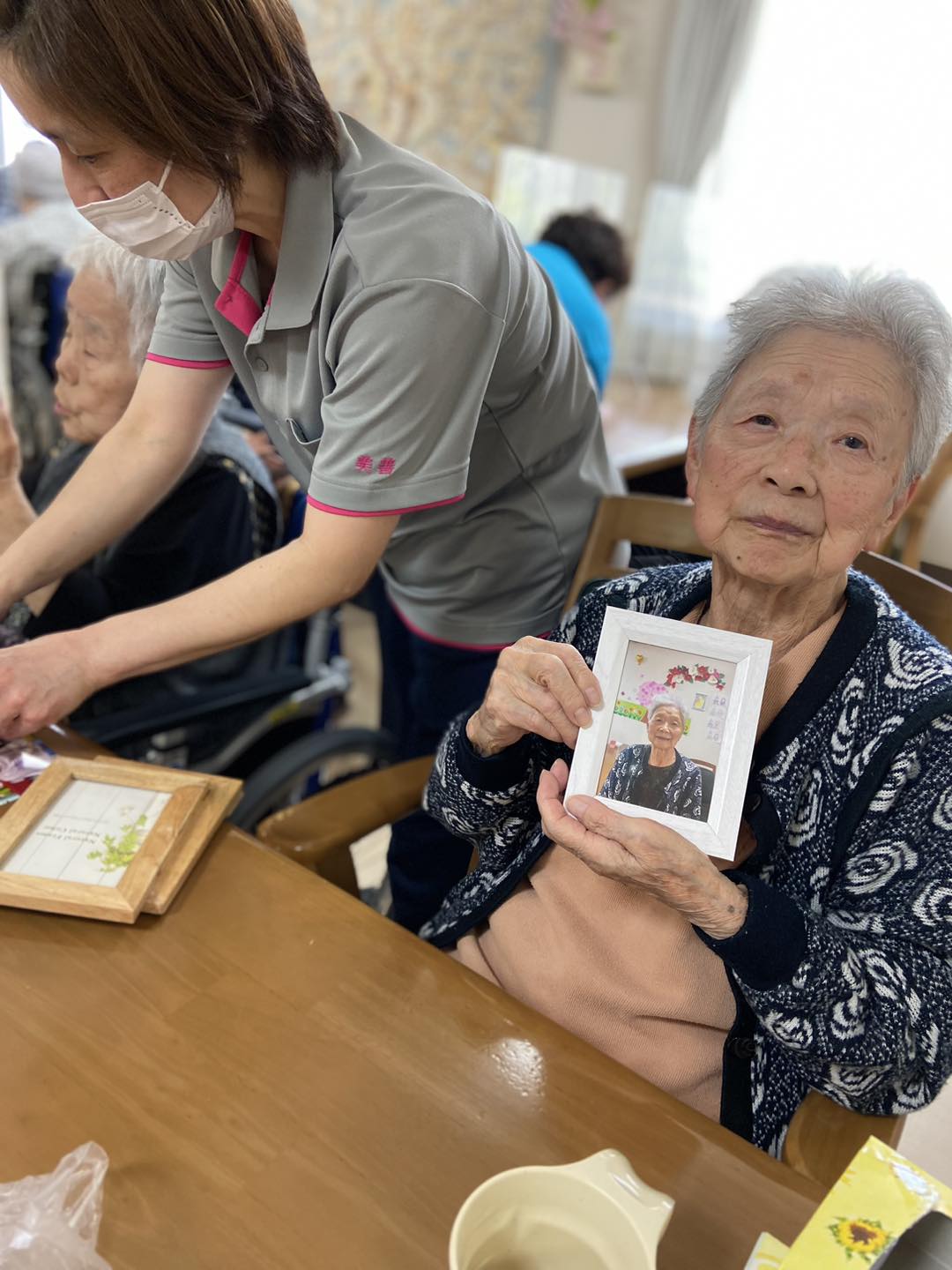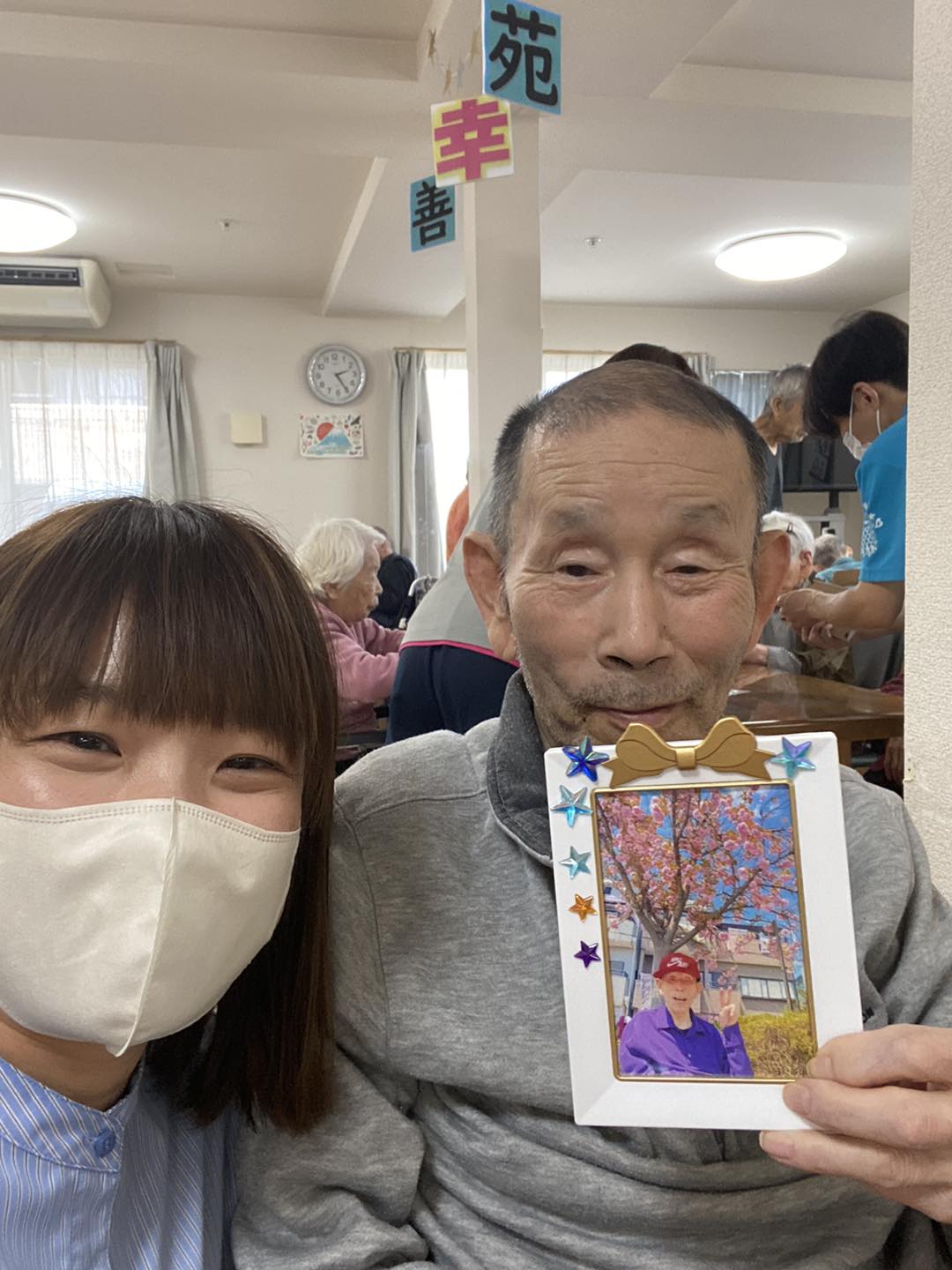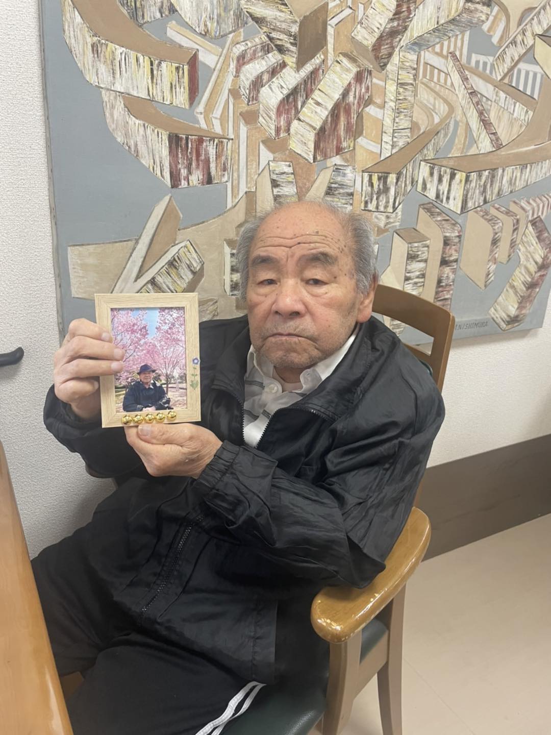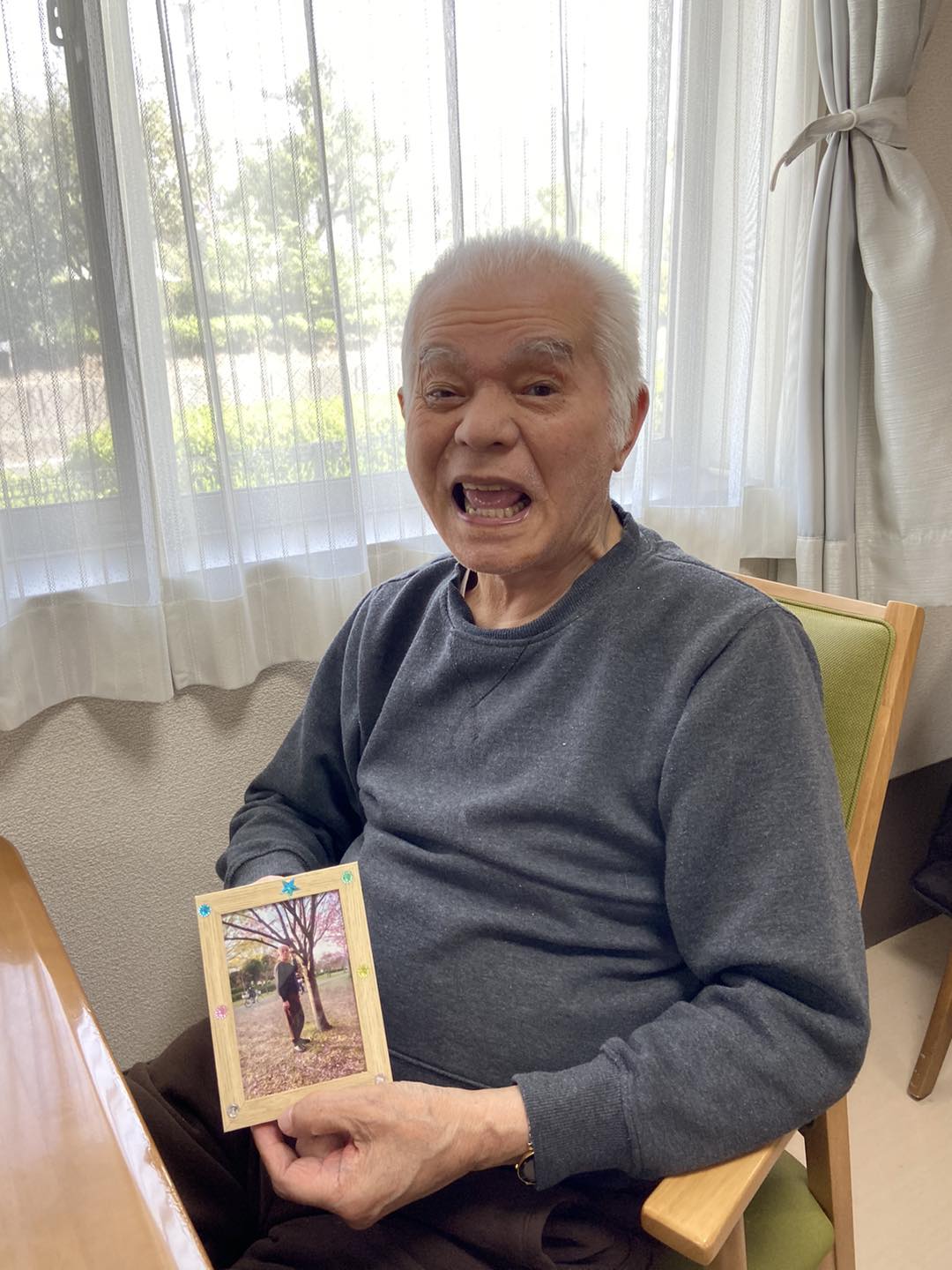 施設の隣の遊歩道で桜の木、近隣の鶴見緑地公園で桜と一緒に外出時に撮った写真をそれぞれ写真立てに入れて、飾り付けをしました