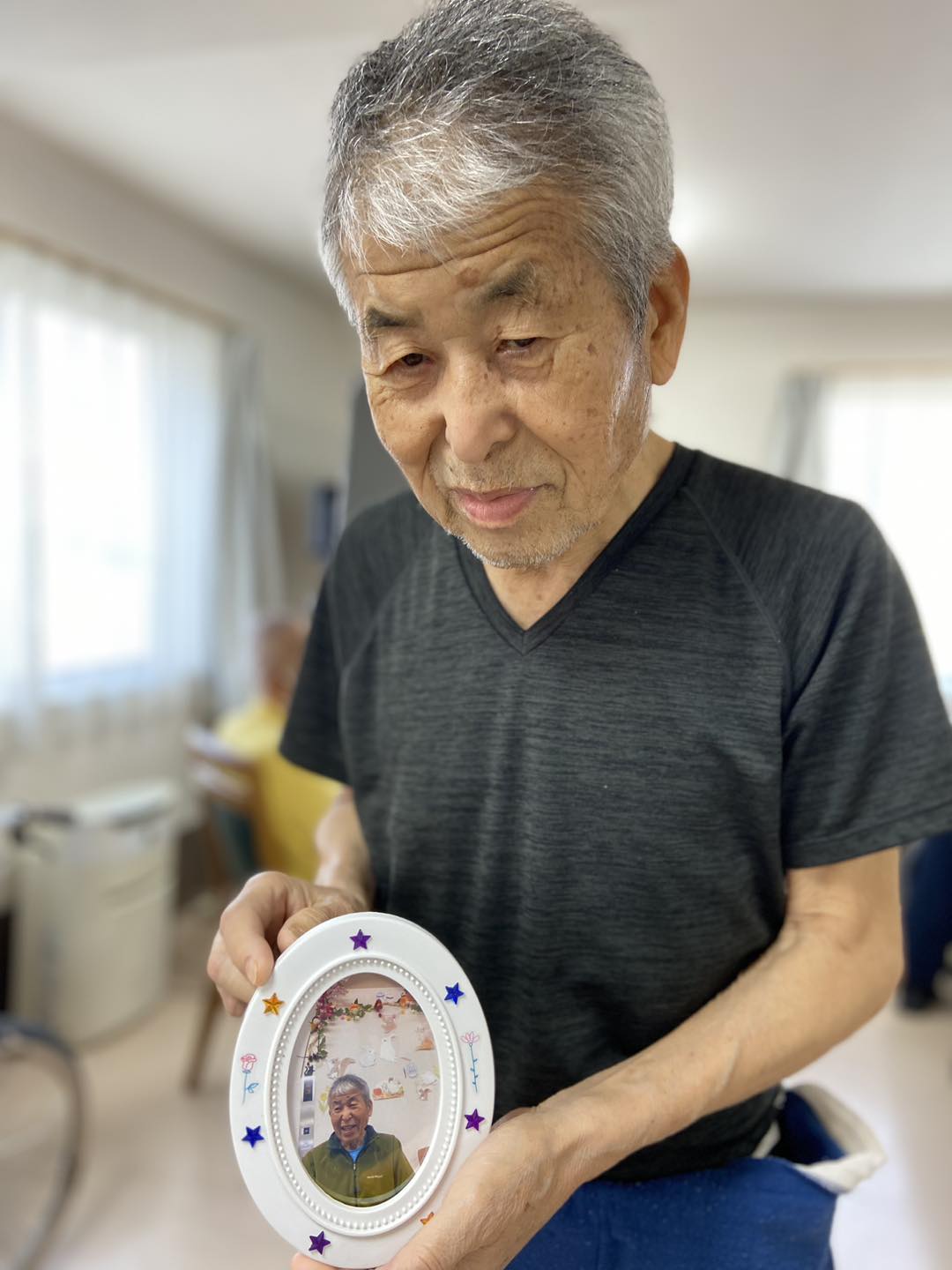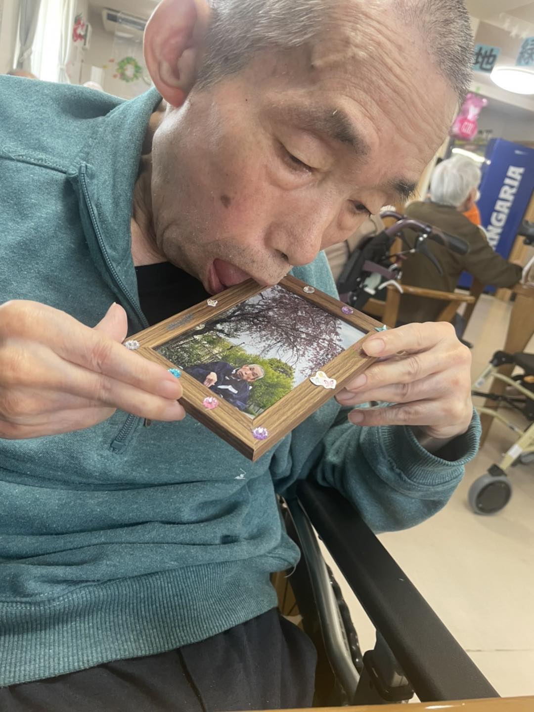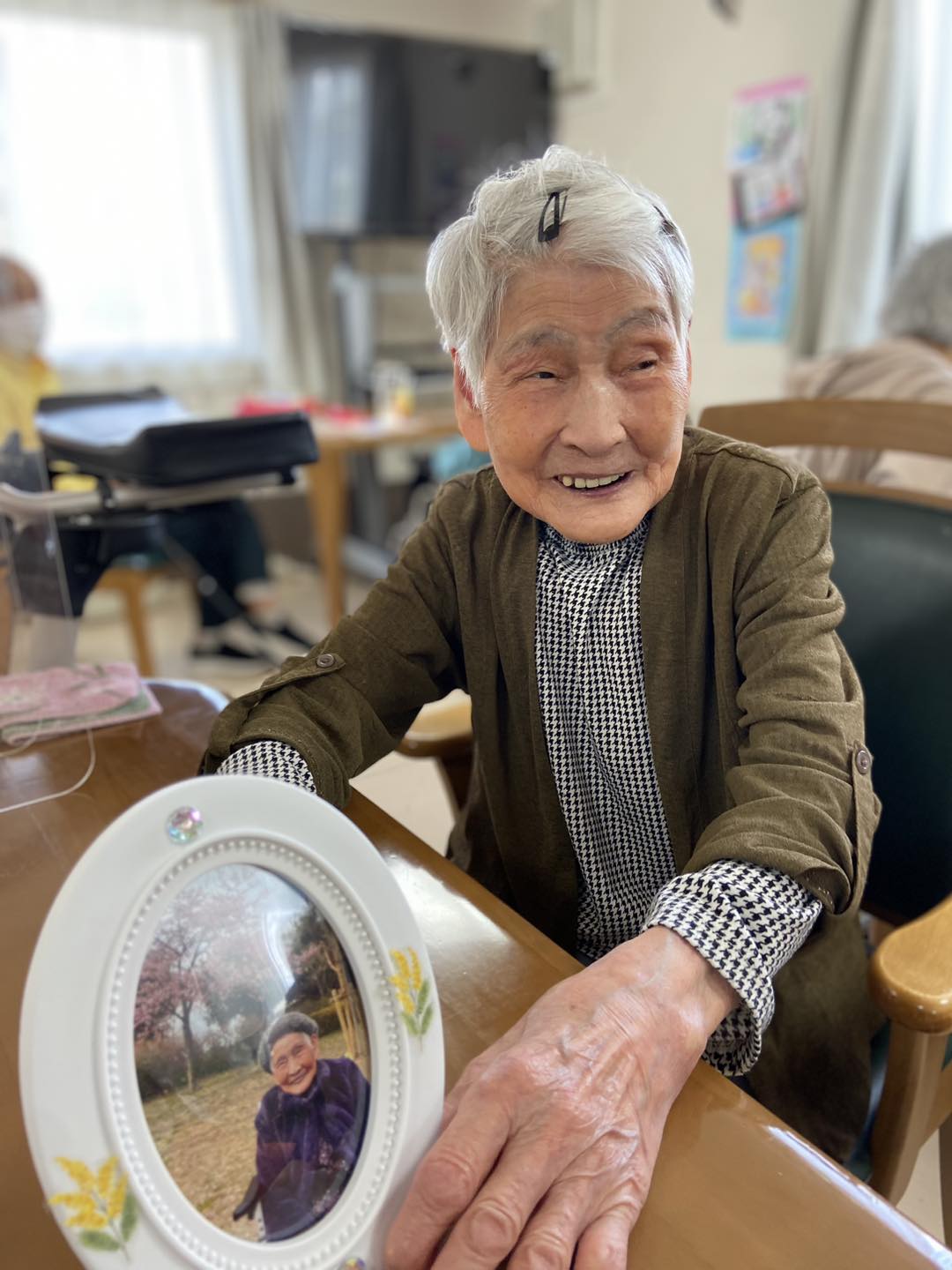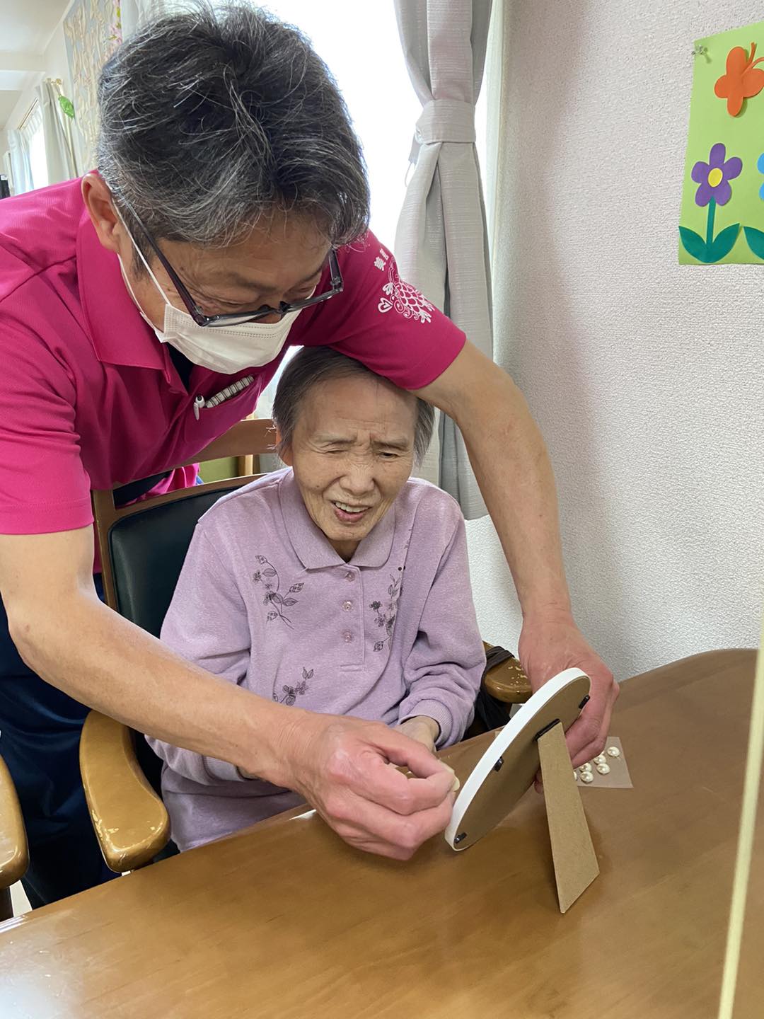 施設の隣の遊歩道で桜の木、近隣の鶴見緑地公園で桜と一緒に外出時に撮った写真をそれぞれ写真立てに入れて、飾り付けをしました