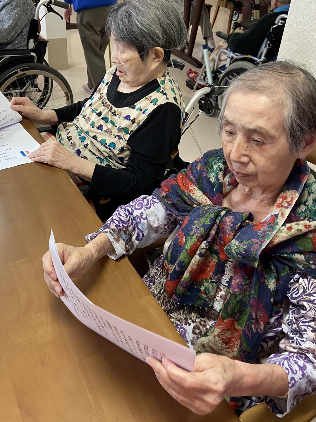 今月のレクリエーションは、5月5日(こどもの日)にちなんだ「童謡」と「昭和の懐かしの名曲」を、皆様で歌いました