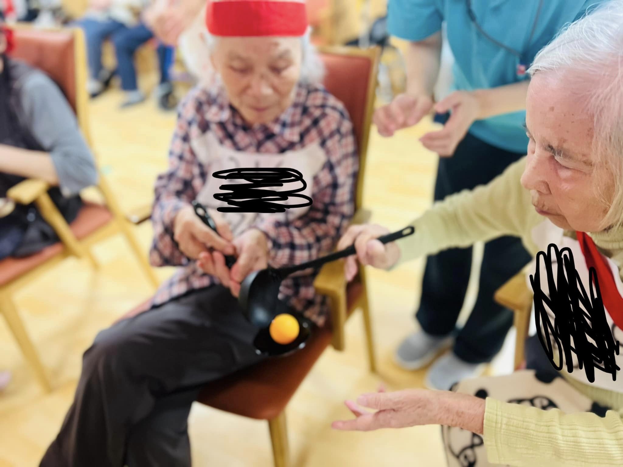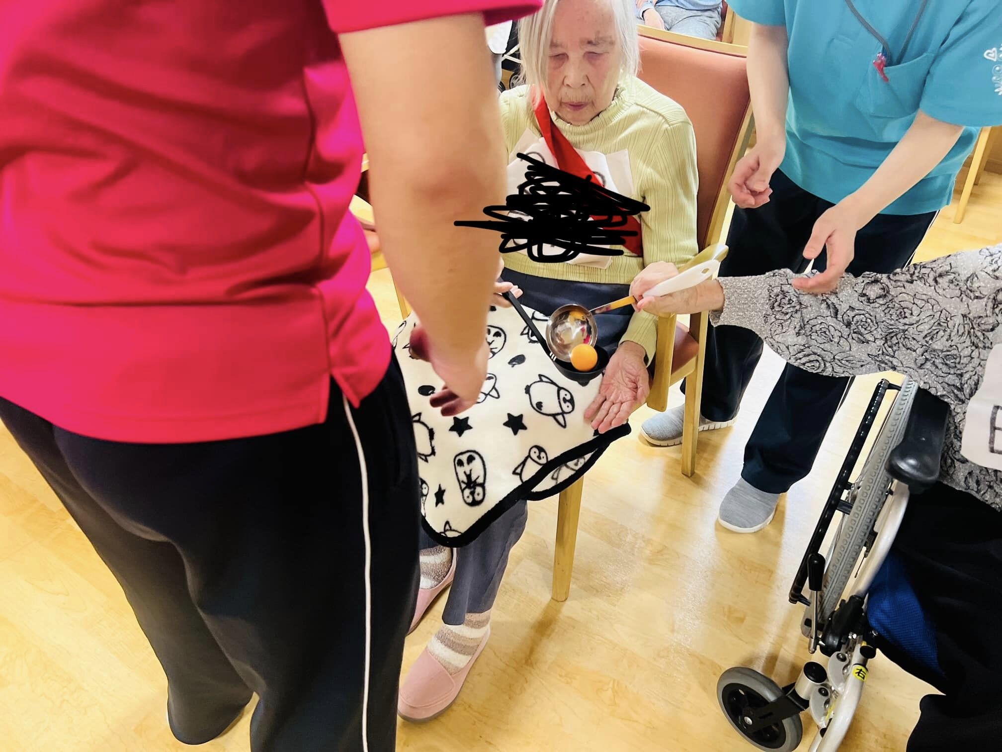 ピンポン球を次の方へバトンを繋ぎ勝利に向かって利用者様一生懸命でした