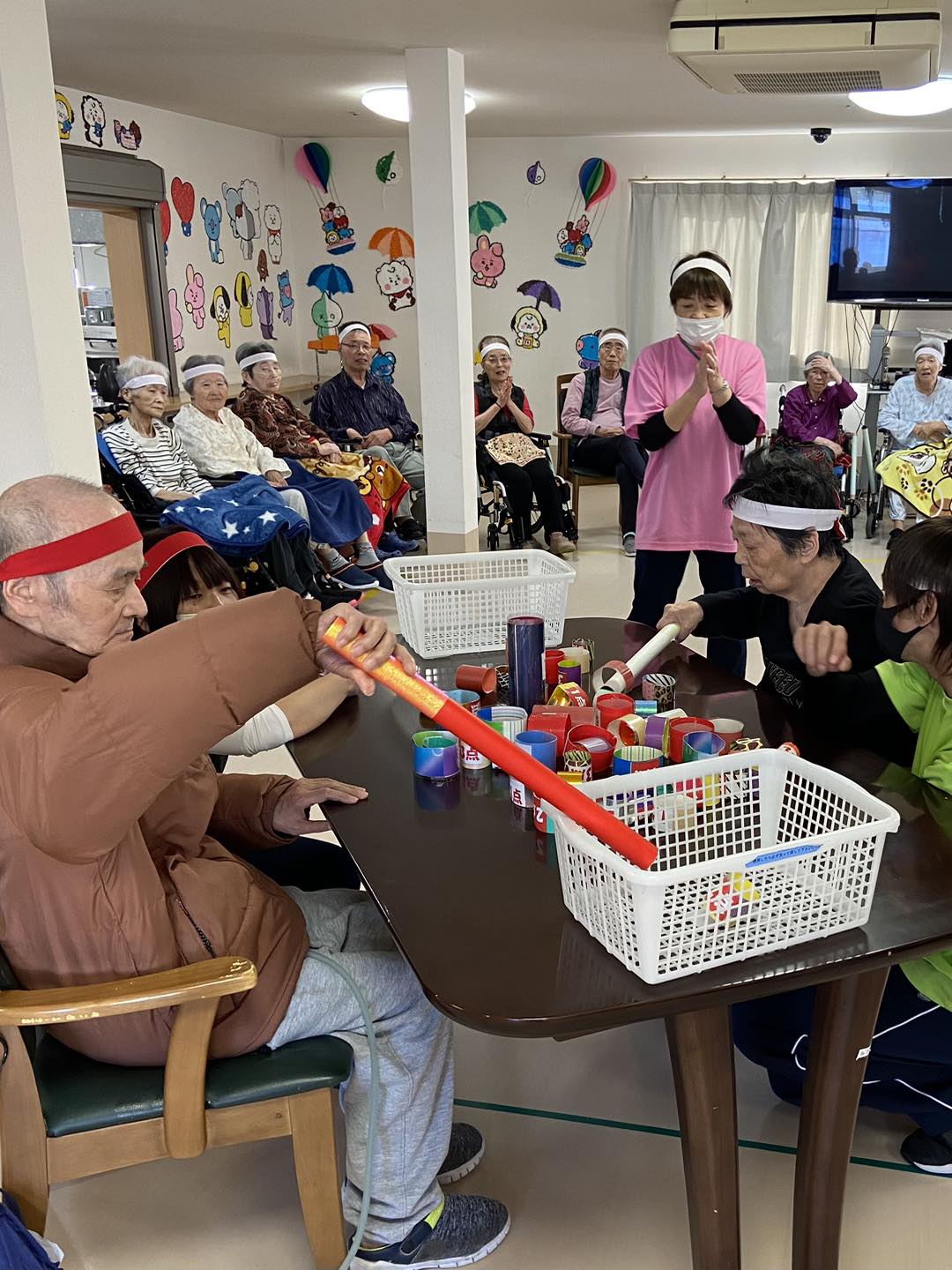 利用者様同士が互いに協力し合い、1つのボールを渡し合って競う競技。普段話さない方々も互いに協力しあって大変盛り上がりました🙌