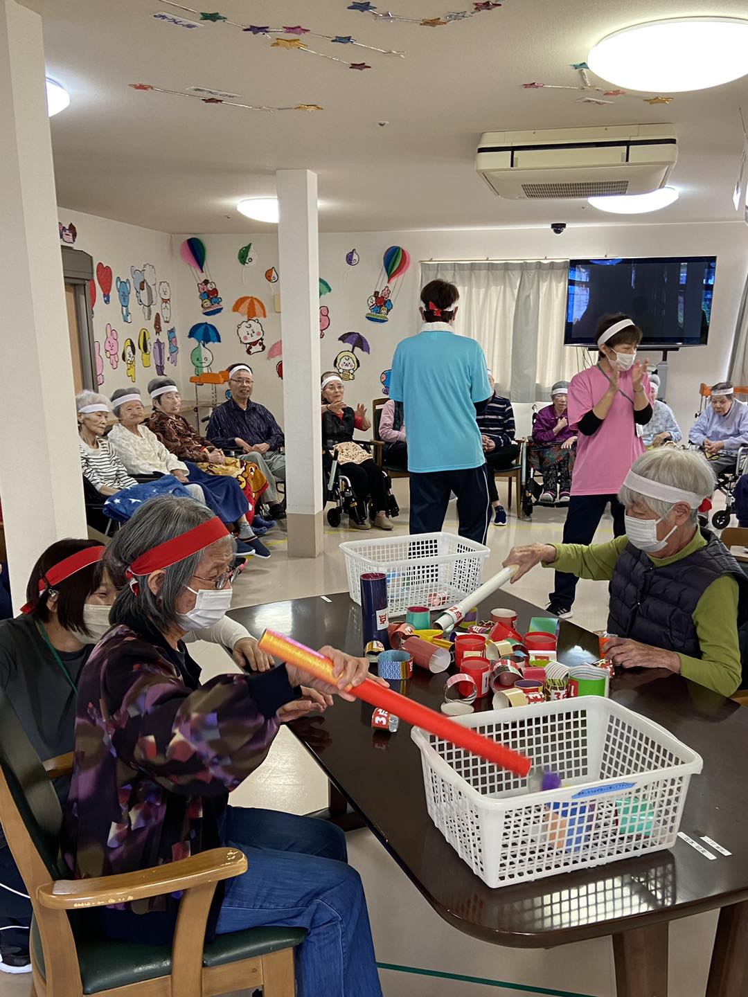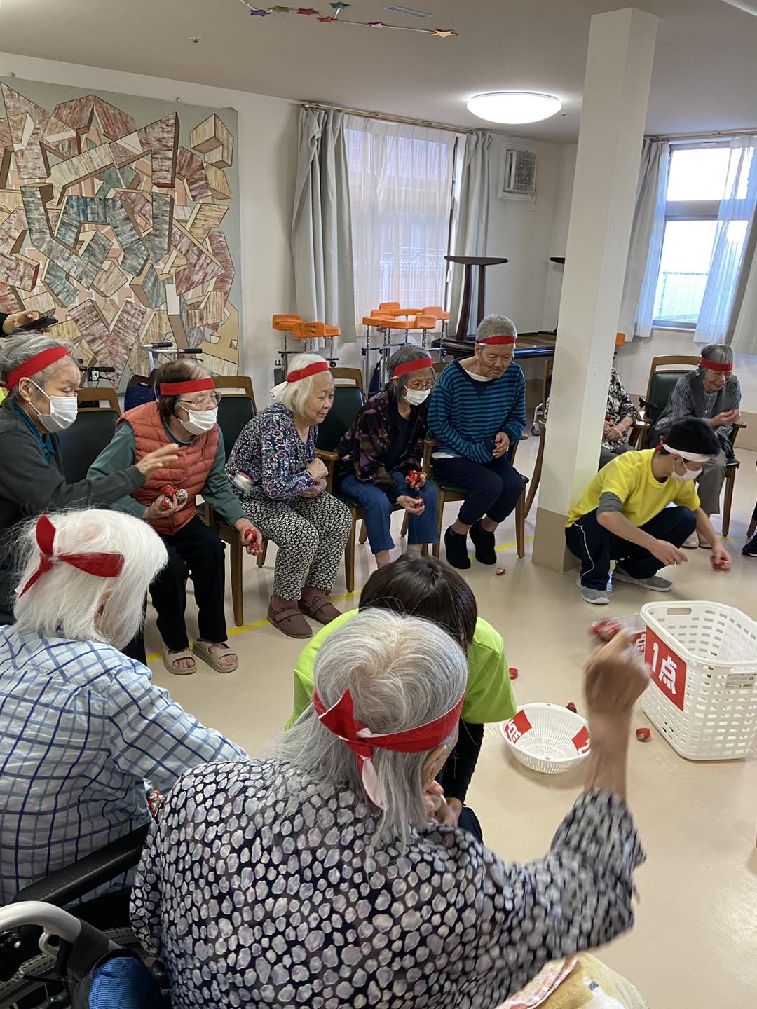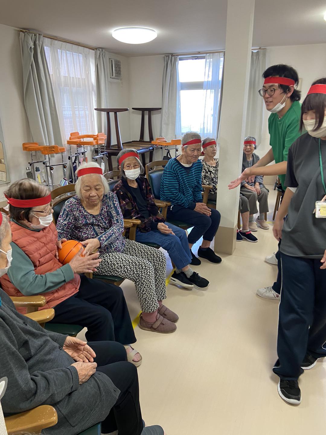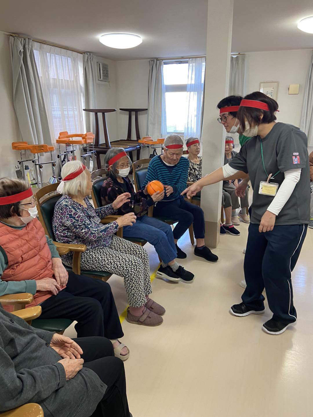 利用者様同士が互いに協力し合い、1つのボールを渡し合って競う競技。普段話さない方々も互いに協力しあって大変盛り上がりました🙌