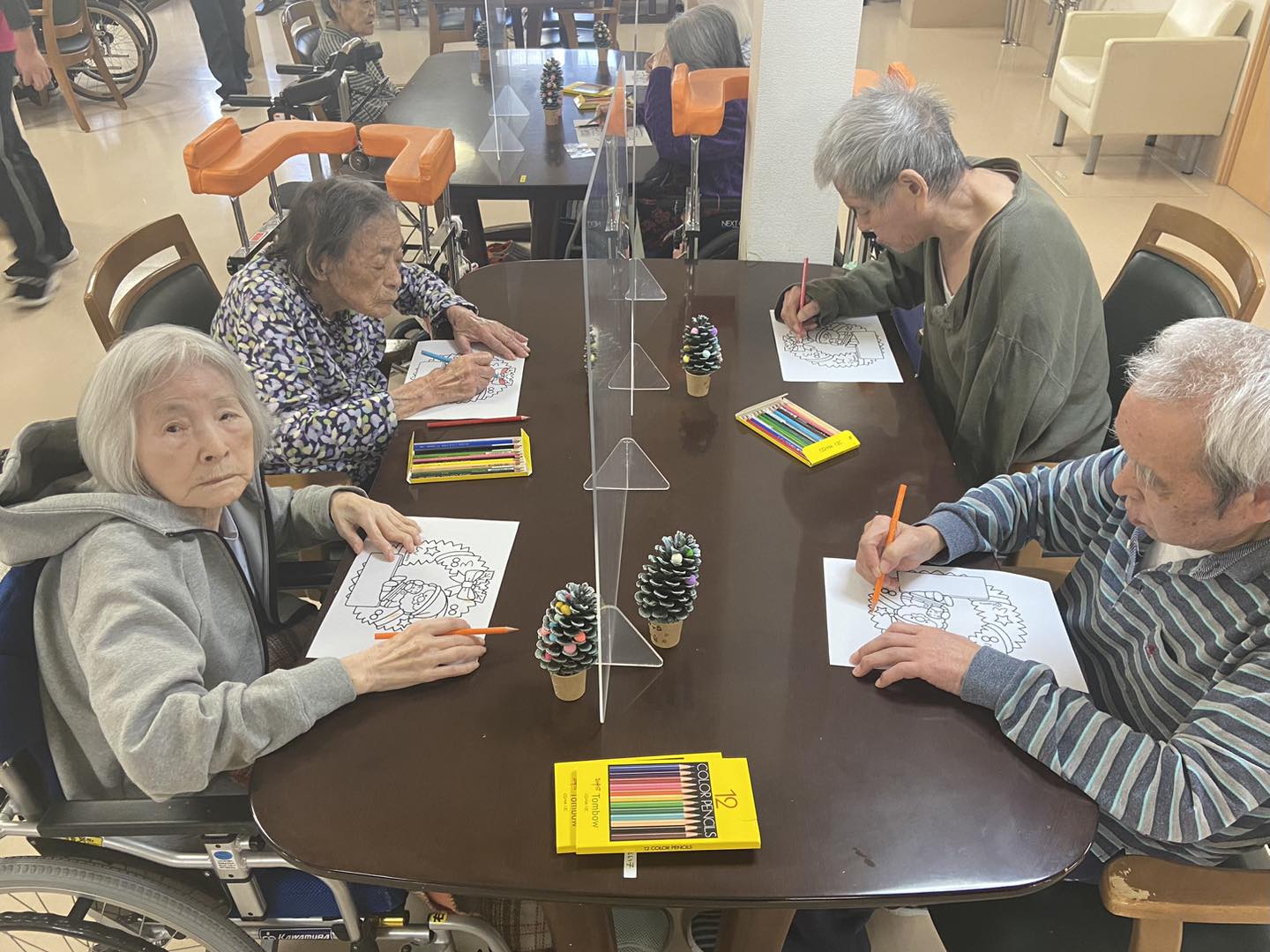 クリスマスにちなんだサンタクロースの🎅イラストを使って塗り絵✒️髭の色が個性的なサンタクロースや、カラフルなトナカイ🦌まで(笑)塗り絵の時間は皆さん黙々と集中して塗り絵されていました☺️