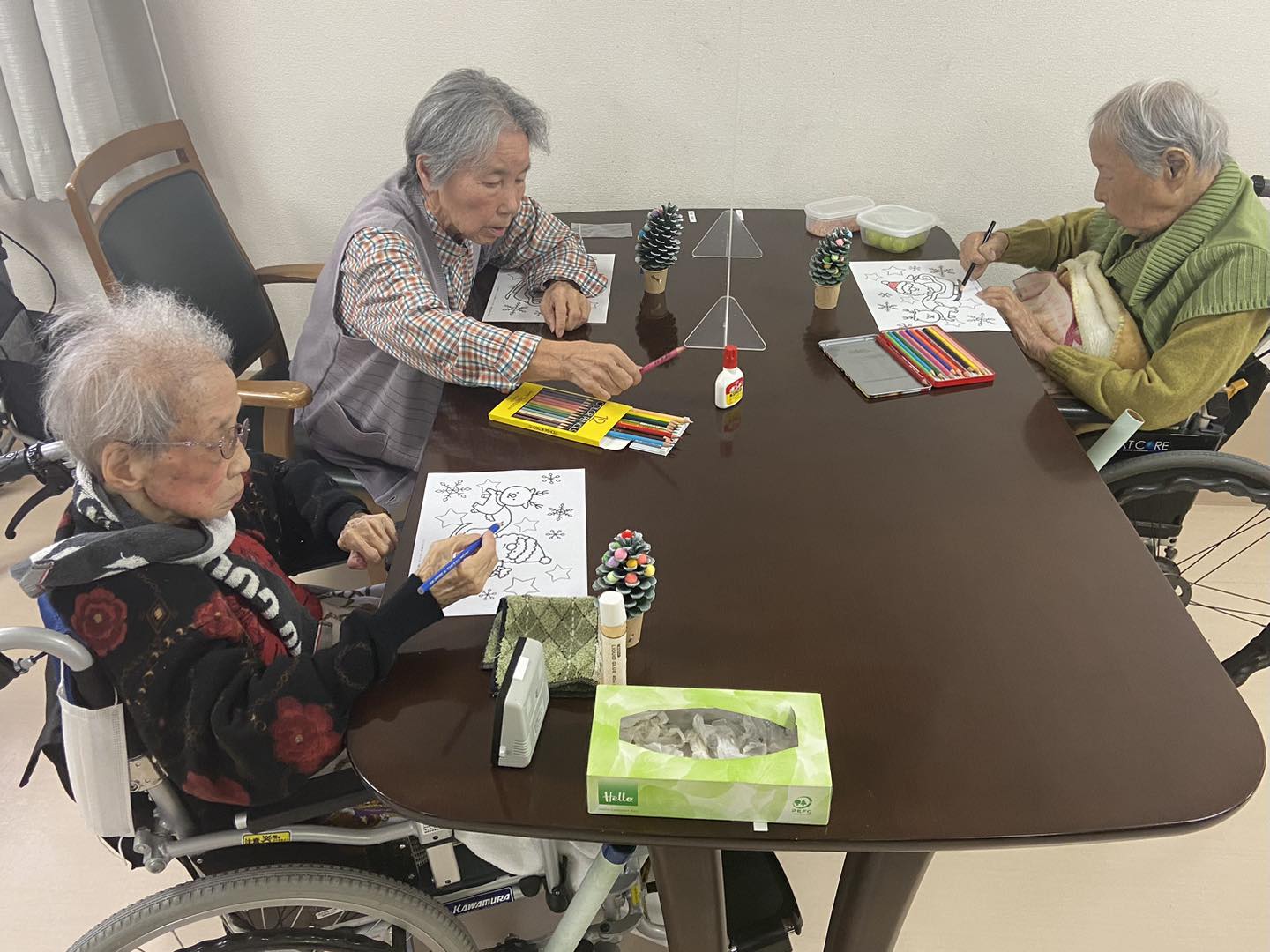 クリスマスにちなんだサンタクロースの🎅イラストを使って塗り絵✒️髭の色が個性的なサンタクロースや、カラフルなトナカイ🦌まで(笑)塗り絵の時間は皆さん黙々と集中して塗り絵されていました☺️
