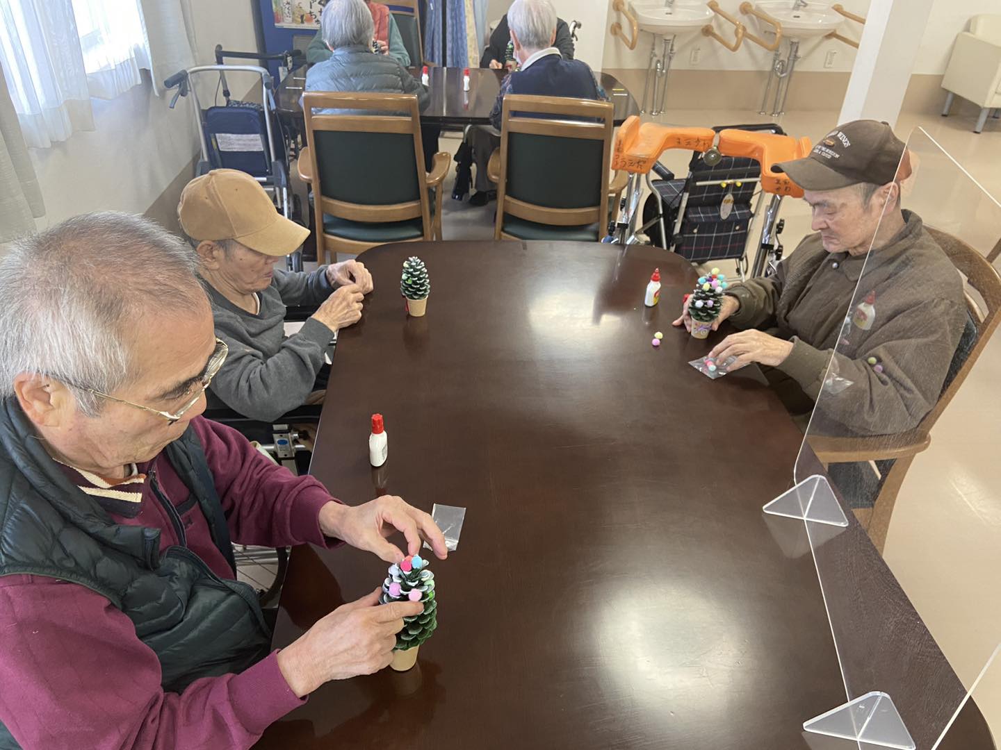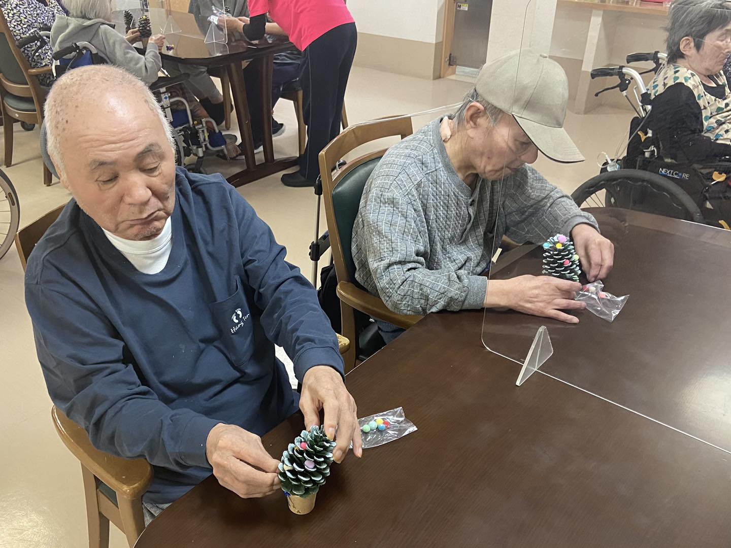 利用者さんには、あらかじめスタッフの方で「松ぼっくり」を使ってツリーを作成🎄。そのツリーに飾り付けを行ってもらいました☺️前から見ても後ろから見ても、飾りがキレイに見えるように、利用者さん同士、話をしながら和やかな楽しい雰囲気でした🎵