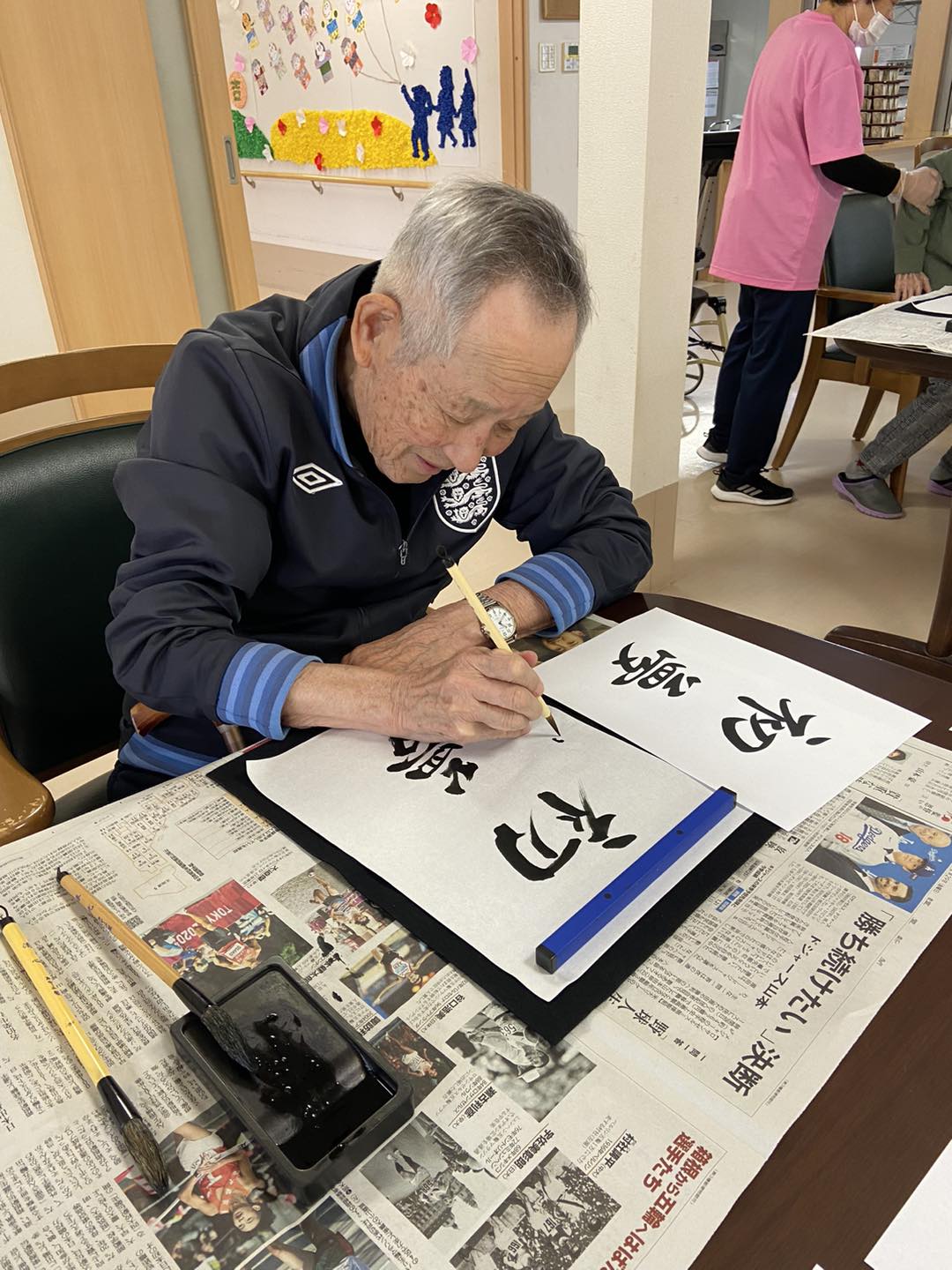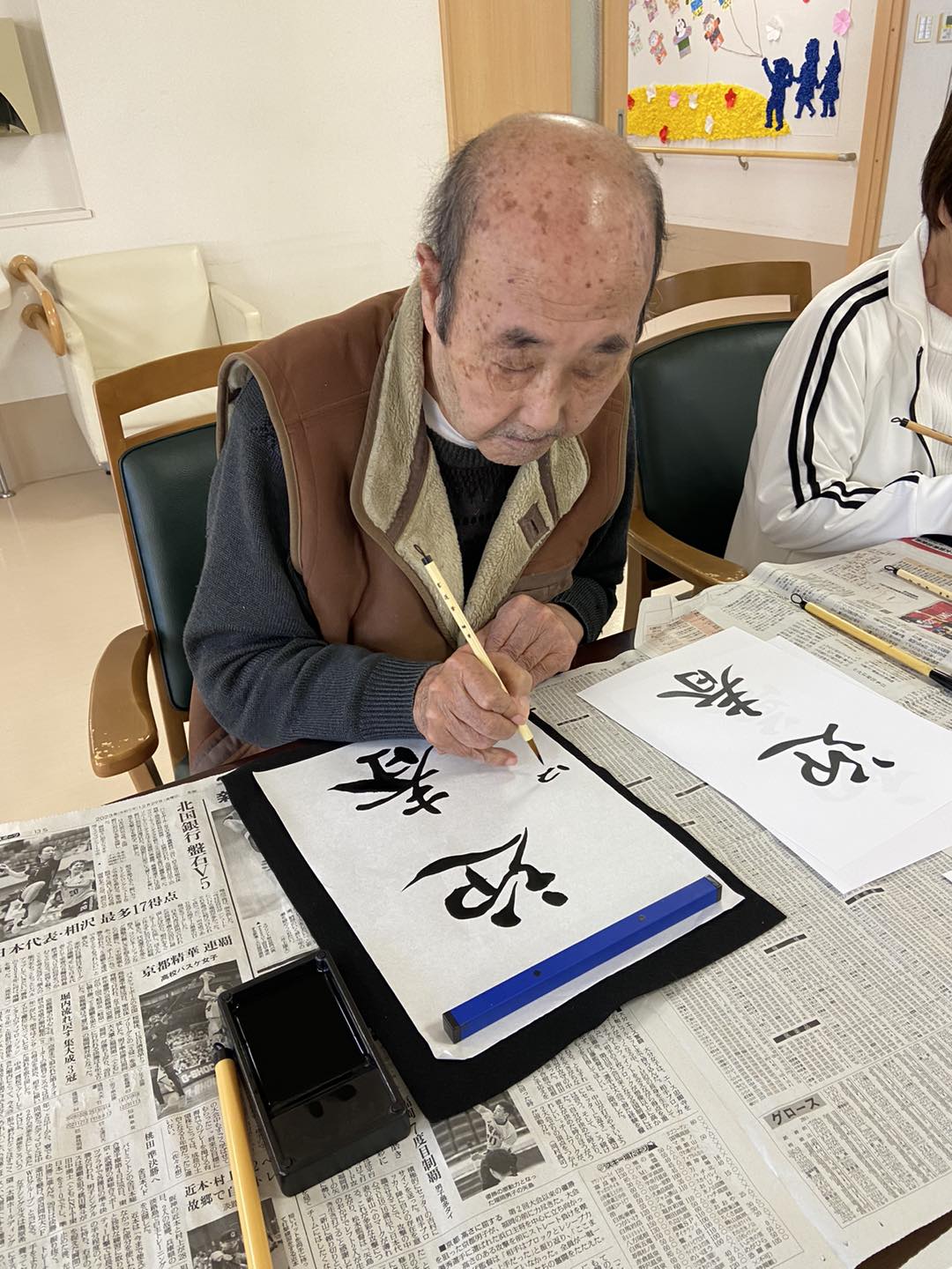 半紙を前にして15分間悩まれる方、2枚、3枚と書かれる方、普段お話をされない利用者様同士、和気藹々と書初めして下さいました。