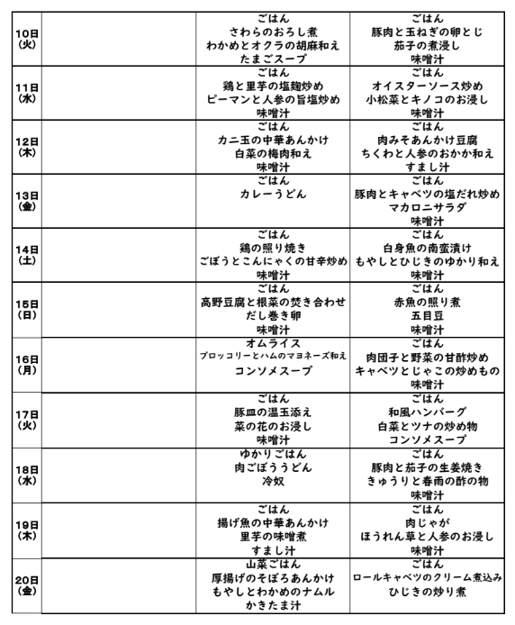 朝食に関しましては、各施設でごはん食やパン食など異なっているので、献立表には記載しておりません。